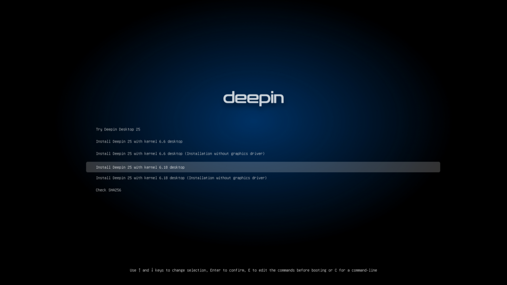 今回は直接インストールを開始するために4番目の「Install Deepin 25 with kernel 6.18 desktop」を選んでEnterキーを押して進めます。