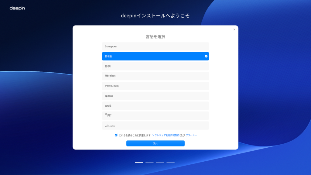 日本語を選択した時点でインストーラの画面表示も日本語に変わりますので、ソフトウェア利用規約にチェックを入れてからボタン「次へ」を押して進めます。