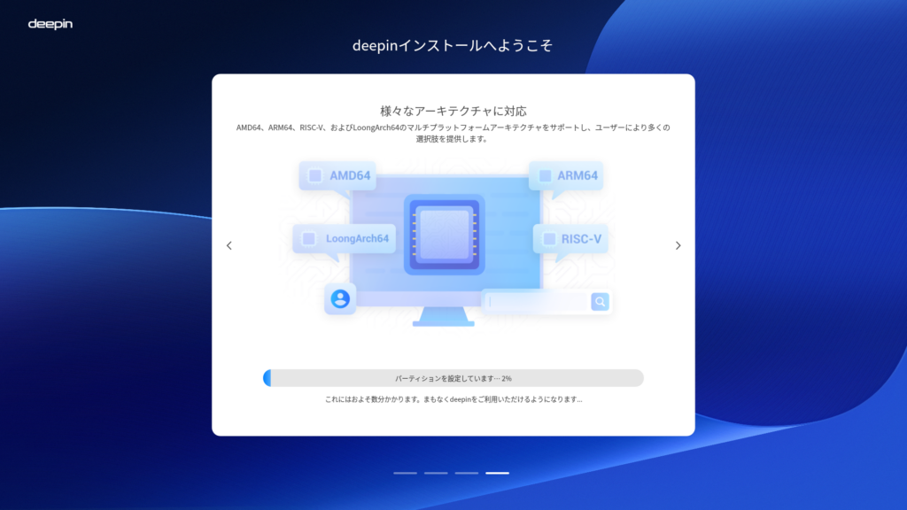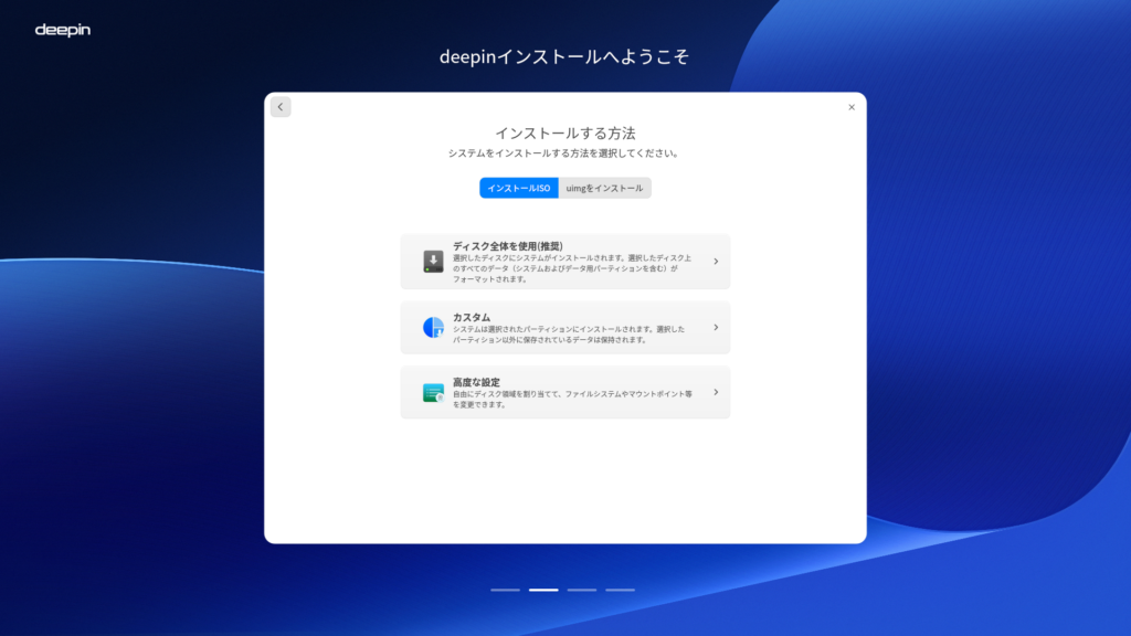 Deepinのデスクトップ環境はDDE(Deepin Desktop Environment)固定です。まずは公式サイトで配布されているisoイメージから起動メディアを作成し、コンピュータに装着して起動します。