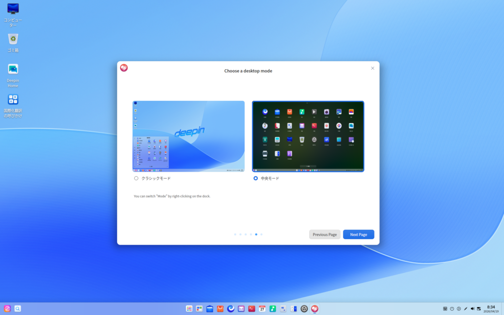 デスクトップモードとして、今回は初期選択されている「中央モード」を選びました。ボタン「Next Page」を押して進めます。