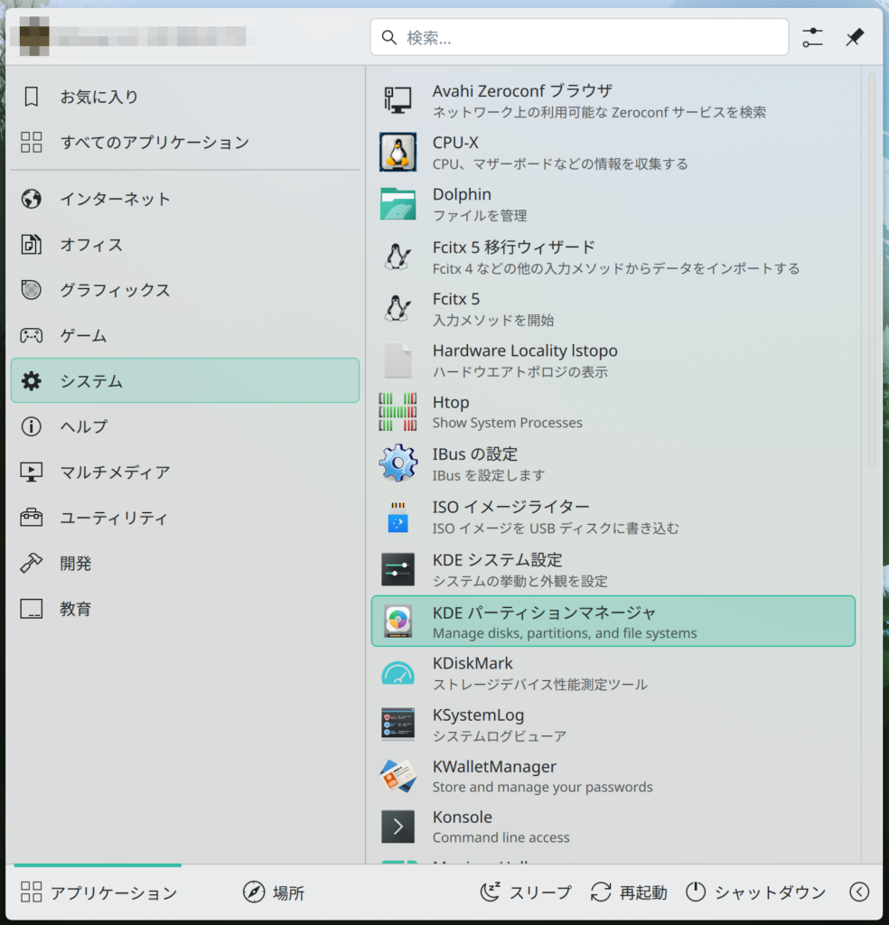 Fig.1-1: アプリケーションメニュー → KDEパーティションマネージャ
