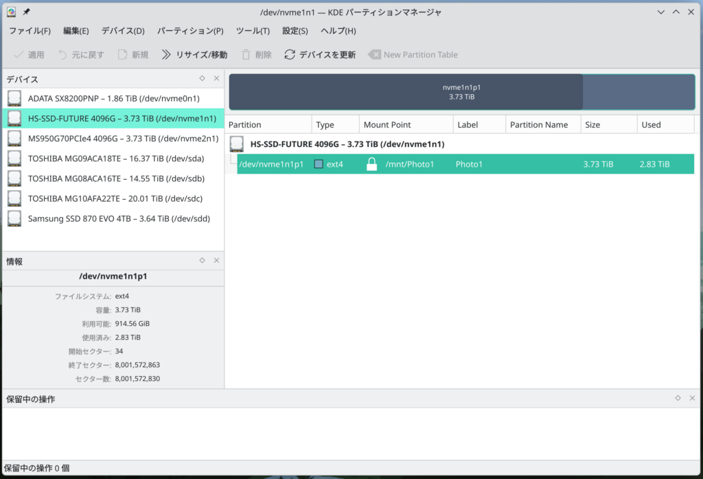 画面の左ペインに、接続が認識されている物理ドライブ一覧およびその実体参照の場所が表示されており、nvmeデバイスの場合は/dev/nvme****、sataデバイスの場合は/dev/sd*となっていることがわかります。