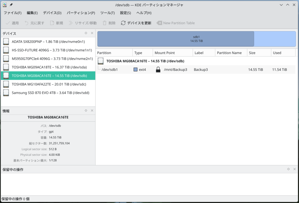 管理者パスワードを入力すると、KDEパーティションマネージャが開きます。