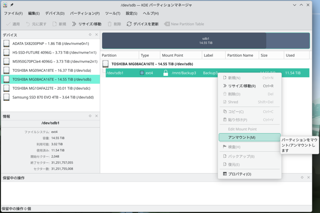 必要な準備ができたら右クリックから「マウント」を実行し、Dolphinファイルマネージャの左ペインにドライブが現れていることを確認してください。