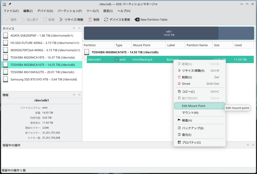 Fig.2-1: 右クリックからEdit Mount Pointでそのパーティションのマウントポイント設定ダイアログを開く