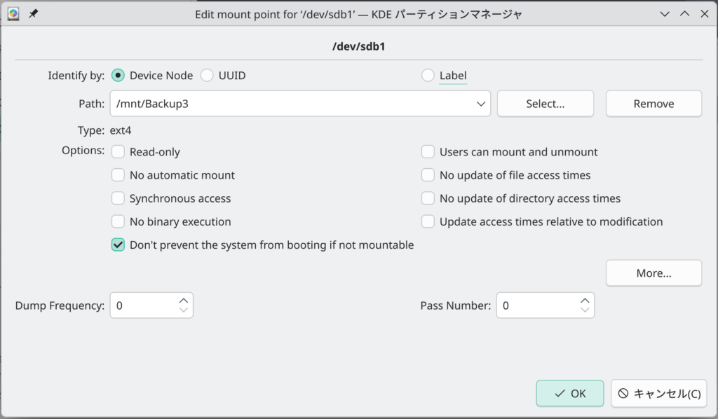 | Label | このラベルはマウント後に、Dolphinファイルマネージャの左ペインにドライブのタイトルとして表示されるので、わかりやすい名前にしておくのが良いです。 |