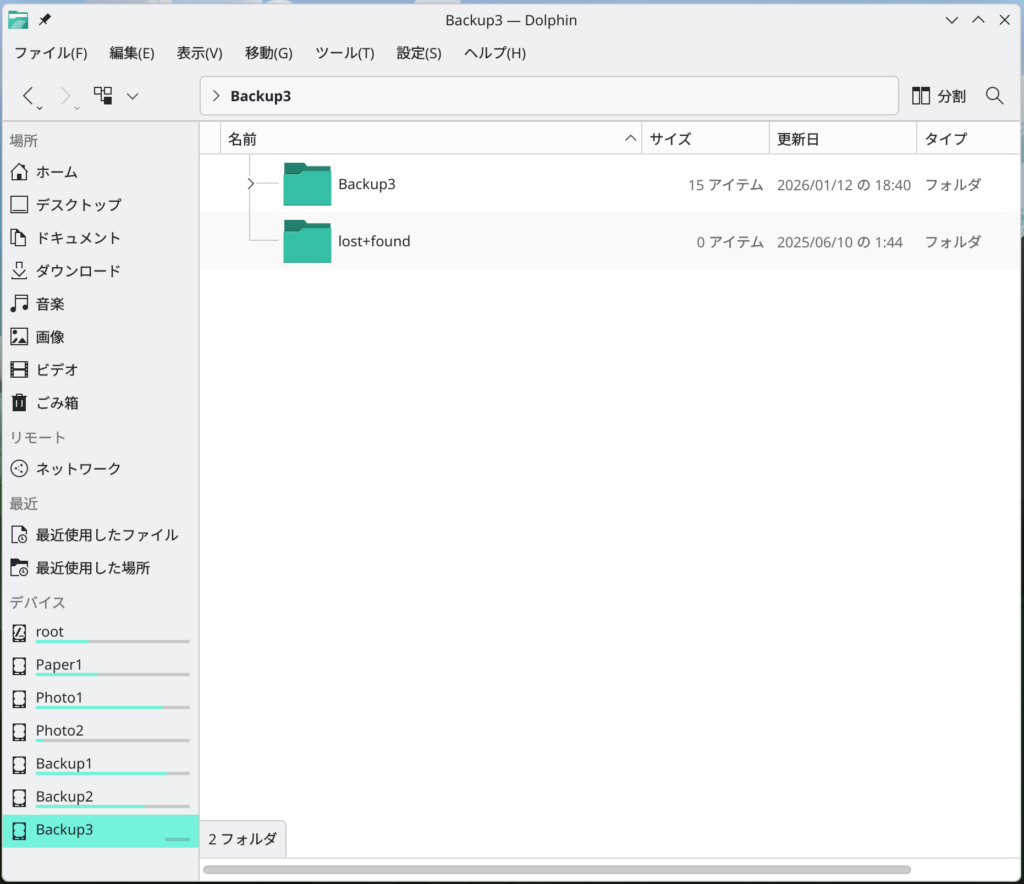 Fig.2-4: Dolphinファイルマネージャの左ペインに物理ドライブが表示されている様子