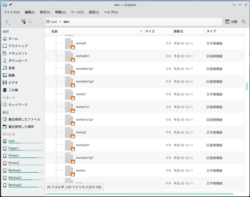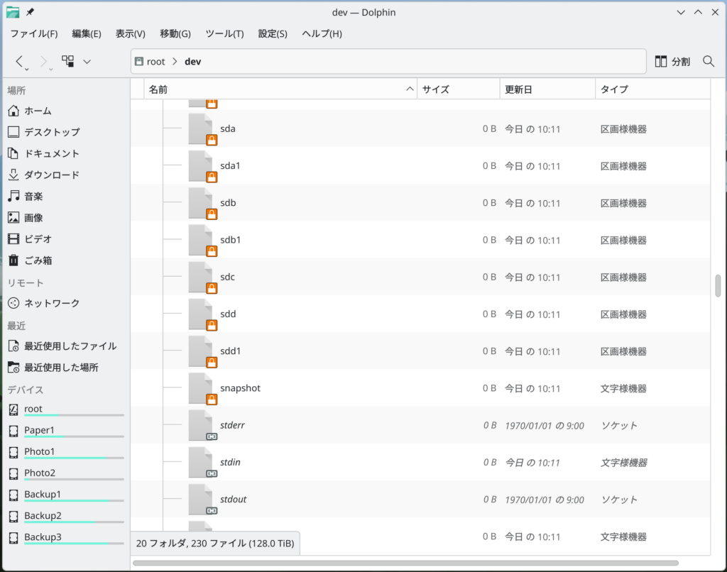 物理ドライブと対になるデバイスファイルの実体、およびパーティションと対になるファイルも、KDEパーティションマネージャの表示を参考にroot/dev/ディレクトリを開いてみることで存在を確認できます。ただこれらのファイルはOSシステム側の管理する領域なので、ユーザ側で何か直接操作することはまずありません。