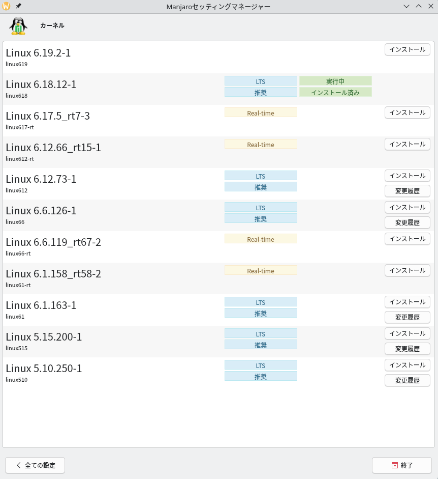 この画面の例で言うと、最も新しいLTS対象バージョンとなるLinux 6.18.12-1カーネルがインストールされており背後で動いています。最新の選択肢として6.19も表示されてはいますがそれはこの時点でまだLTSになっていません。しかし、あえて試してみたい時は右側の「インストール」ボタンを押してインストールを行い再起動することで6.19に更新することもできます。