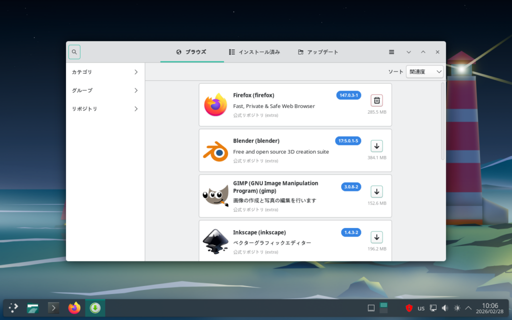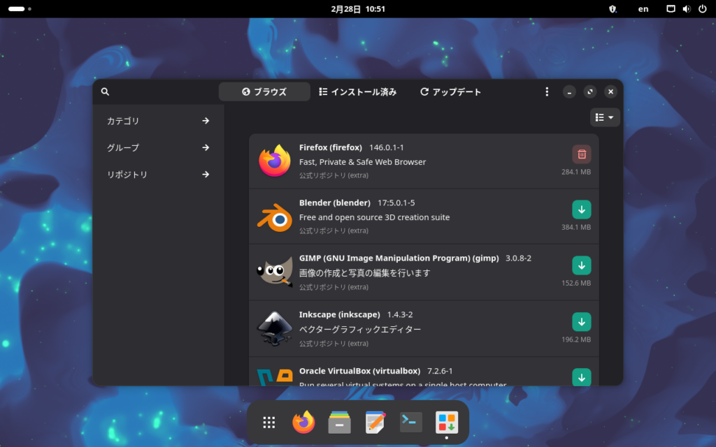 ただし、ここにはリポジトリ上の全てのソフトウェアがリストアップされているわけではなく、比較的メジャーなソフトウェアのみです。FcitxやIBusといったシステム周りのソフトウェアは無いため、それらが必要な場合はターミナルからPacmanコマンドでインストールを行う必要がある点には注意が必要です。