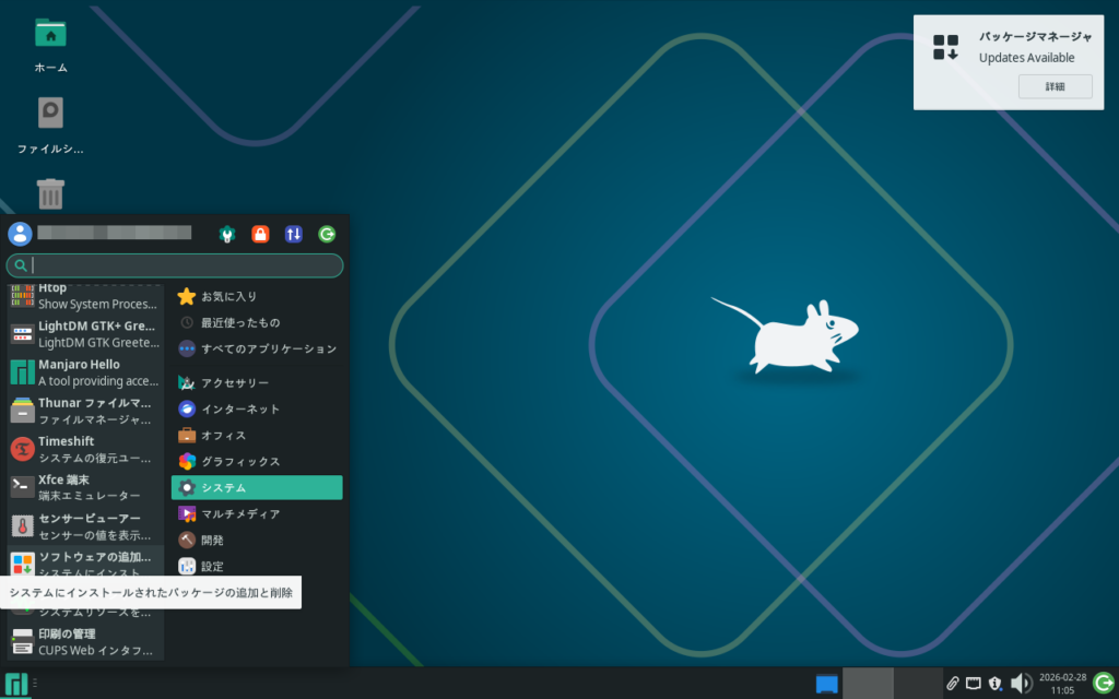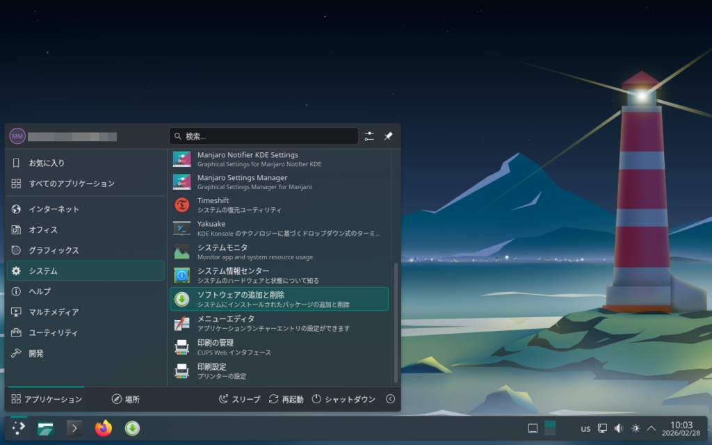 Manjaro KDEのパッケージマネージャはPamacという名前のManjaro独自ソフトウェアです。アプリケーションメニューから「システム」→「ソフトウェアの追加と削除」を選んで起動します。