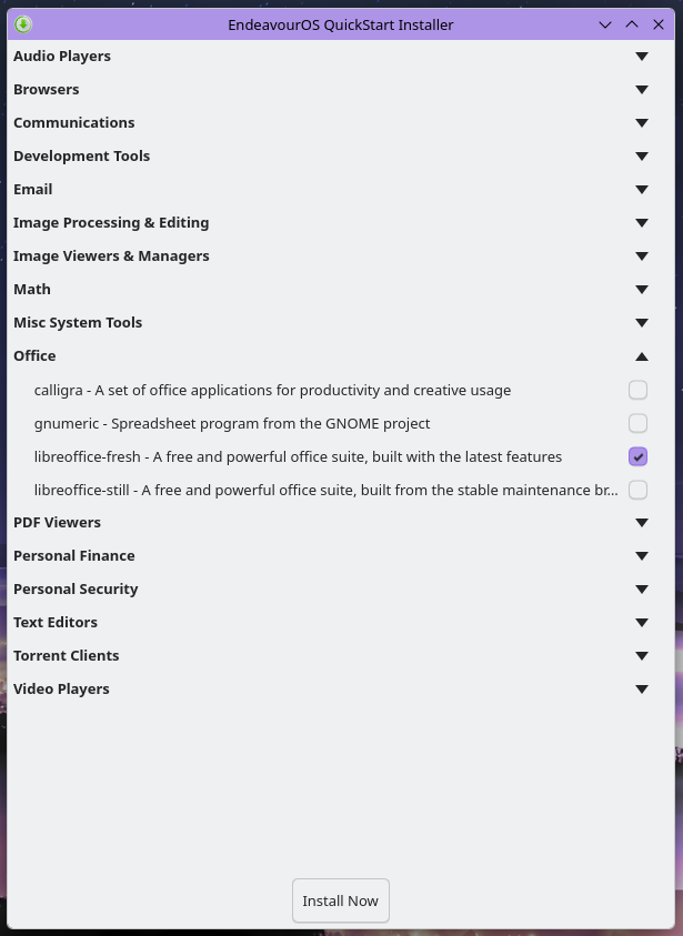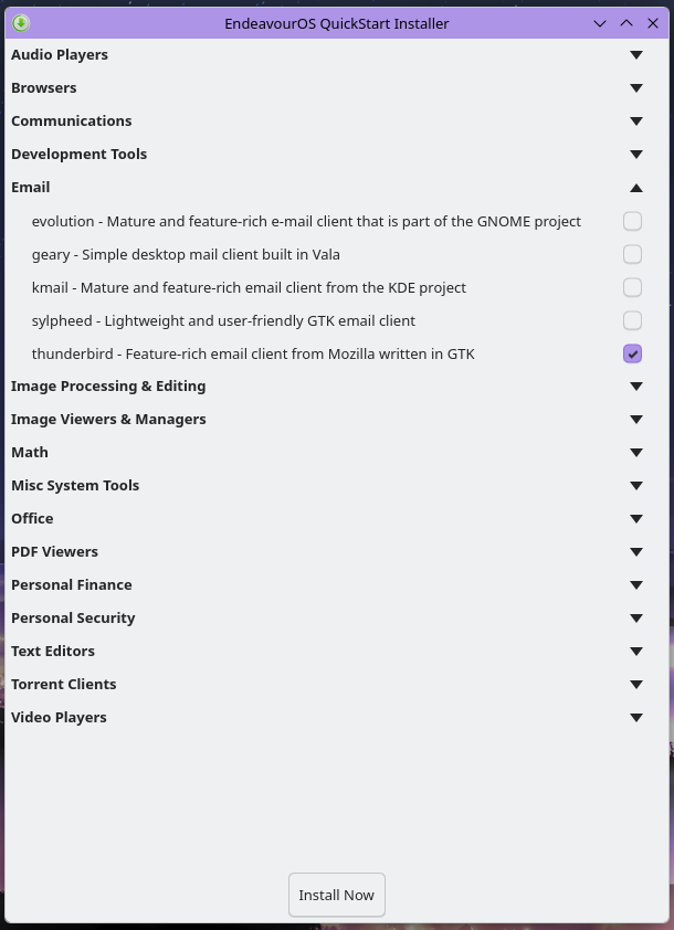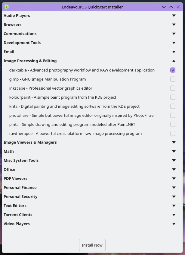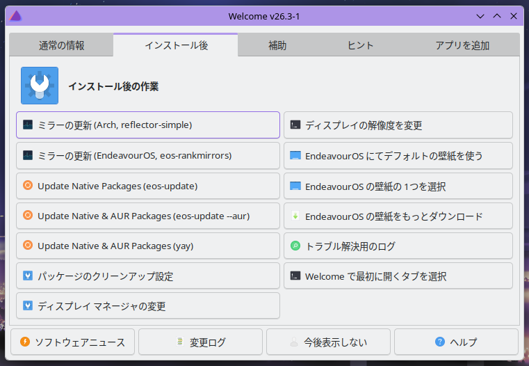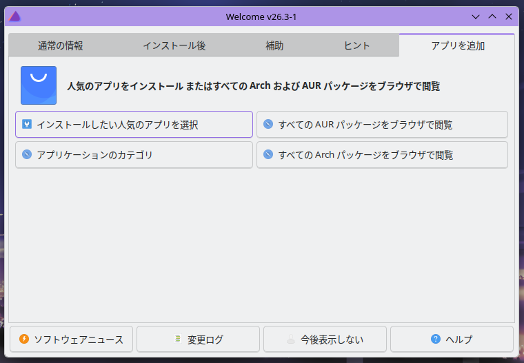 EndeavourOSは単体のプリインストールされたGUIパッケージ管理用ソフトウェアを備えていませんが、ウェルカムダイアログの機能の一部として備わっているアプリケーションソフトウェアリストから選択してインストールすることができます。