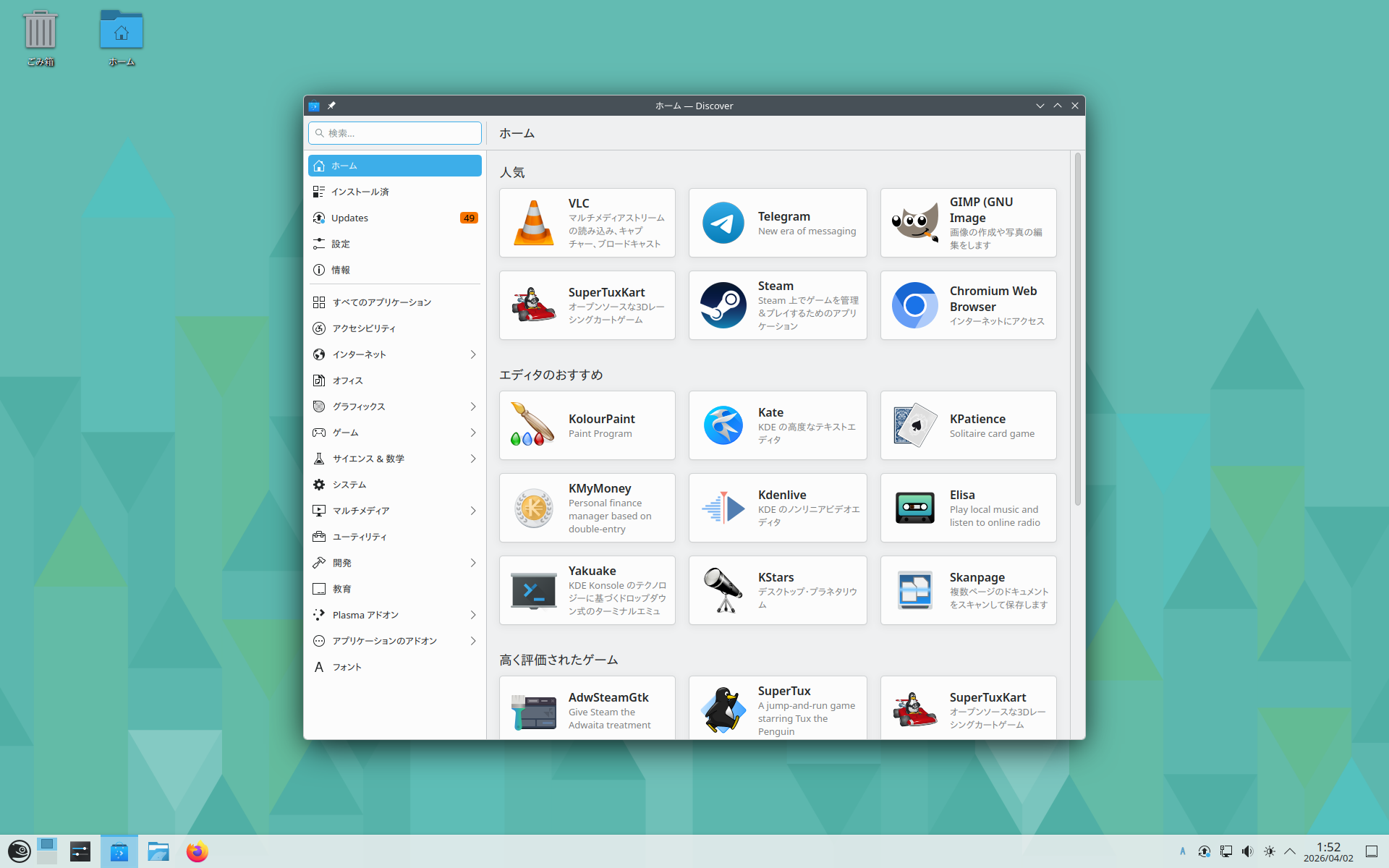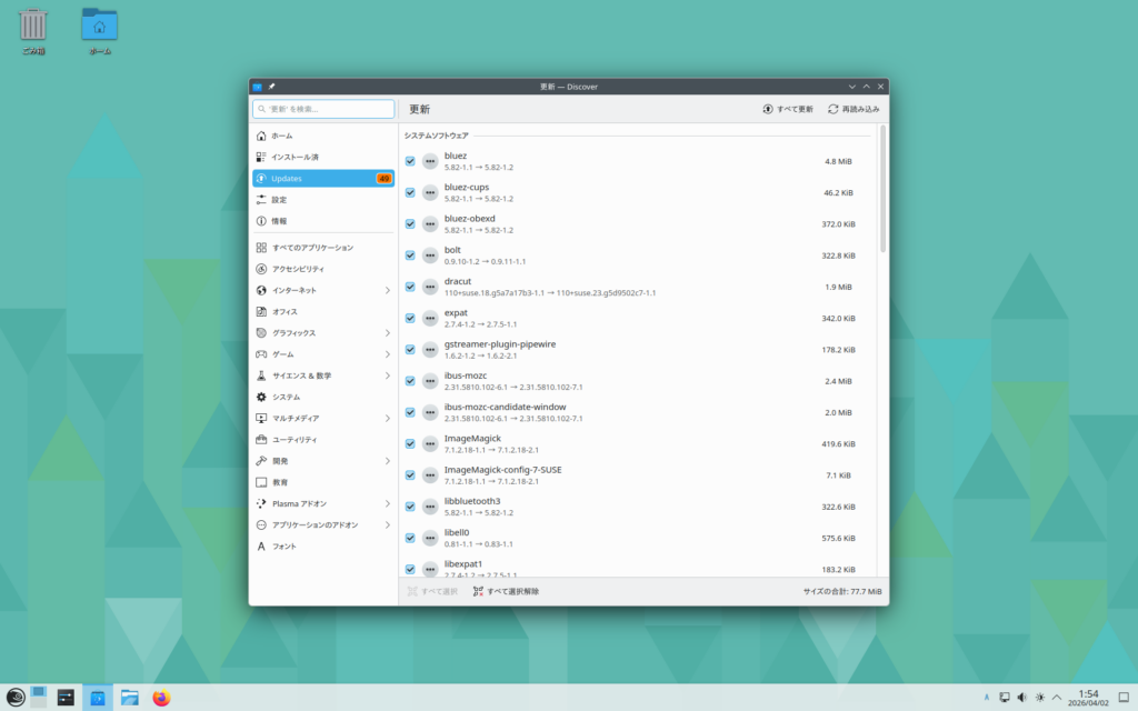 現時点のOpenSUSE Tumbleweed KDEでは、KDEアプリケーションのひとつであるDiscoverからパッケージを管理するのが実用上一番使いやすそうに思われます。インストール直後のタスクバーにもDiscoverへのショートカットが登録されており、さらにローリングリリース方式のOpenSUSE Tumbleweedはアップデートも頻繁に発生しますが、その際はDiscoverの左ペインに目立つ色のマークが表示されるためすぐ確認できます。