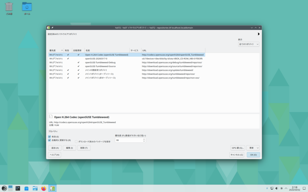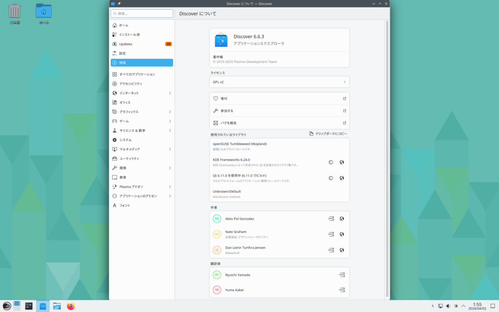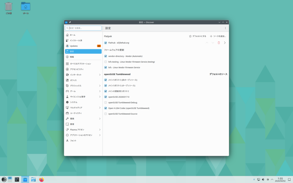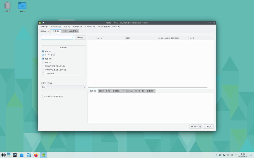このように、初めてOpenSUSE Tumbleweedを使い始める時はパッケージマネージャ一が複数あることに少し戸惑うかもしれませんが、整理してみると実用上の問題はないので大丈夫です。
