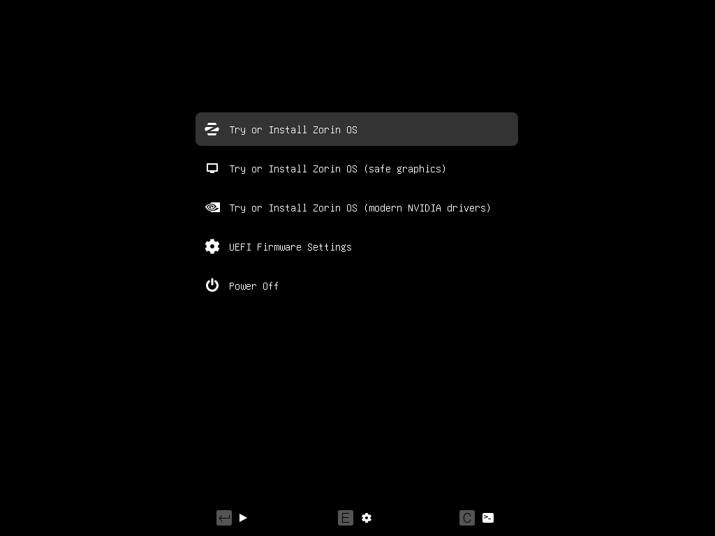 AMD/Intel製グラフィックチップ搭載コンピュータの場合は一番上のTry or Inistall Zorin OSを選択してEnterキーを押し、Liveモードで起動しましょう。また、NVIDIA製の場合は3番目のmodern NVIDIA driversを選択します。