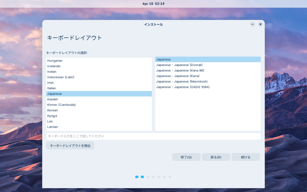日本語を選択した場合は自動的にJapanese/Japaneseの状態になっていますので、日本語キーボードで間違いなければそのままボタン「続ける」を押して進めます。