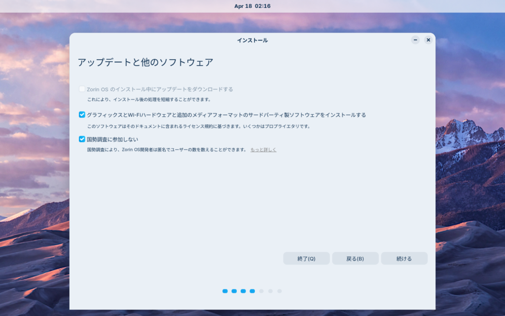 マルチメディアコーデックについてはサーバー用途等でない限りインストールしておいたほうが無難なので、チェックを入れたままにしておきましょう。また使用状況を開発元に送信するかどうかは任意で、いずれかを選択してからボタン「続ける」を押して進めます。