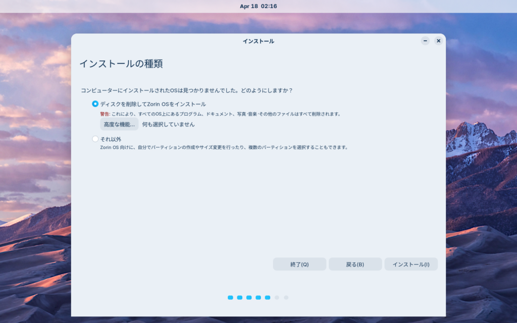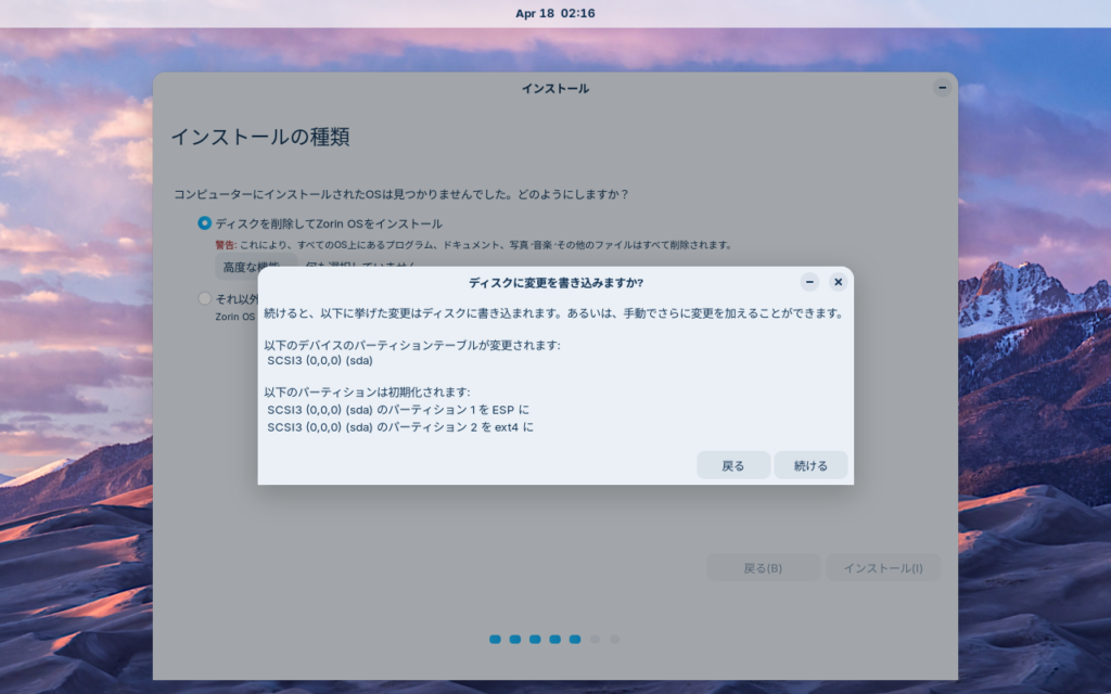 「ディスクを削除してZorin OSをインストール」を選択し、右下のボタン「インストール」を押すと確認ダイアログが表示されます。